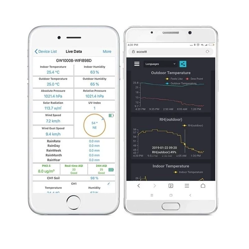🌕 تمامی دادههای جمعآوریشده میتوانند به سرور رایگان Ecowitt Weather آپلود شوند تا به نمودارهای جامع، آرشیو دقیق و امکان دانلود سوابق تاریخی دسترسی داشته باشید. همچنین، امکان تنظیم هشدارهای ایمیلی برای تمام سنسورها وجود دارد.