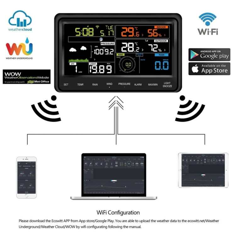 با اتصال Wi‑Fi، دادههای شما به سرویسهای محبوب آب و هوایی مانند Ecowitt Weather، Weather Underground، Weather Cloud، WOW و حتی وبسایت سفارشی شما منتقل میشود.