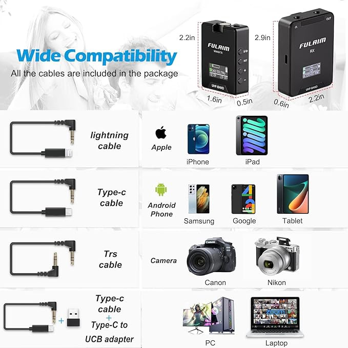 این سیستم میکروفون همراه با کابلهای TRS، TRRS، USB-C و Lightning عرضه میشود و شما میتوانید گیرنده را مستقیماً به انواع دستگاهها متصل کنید، از جمله: