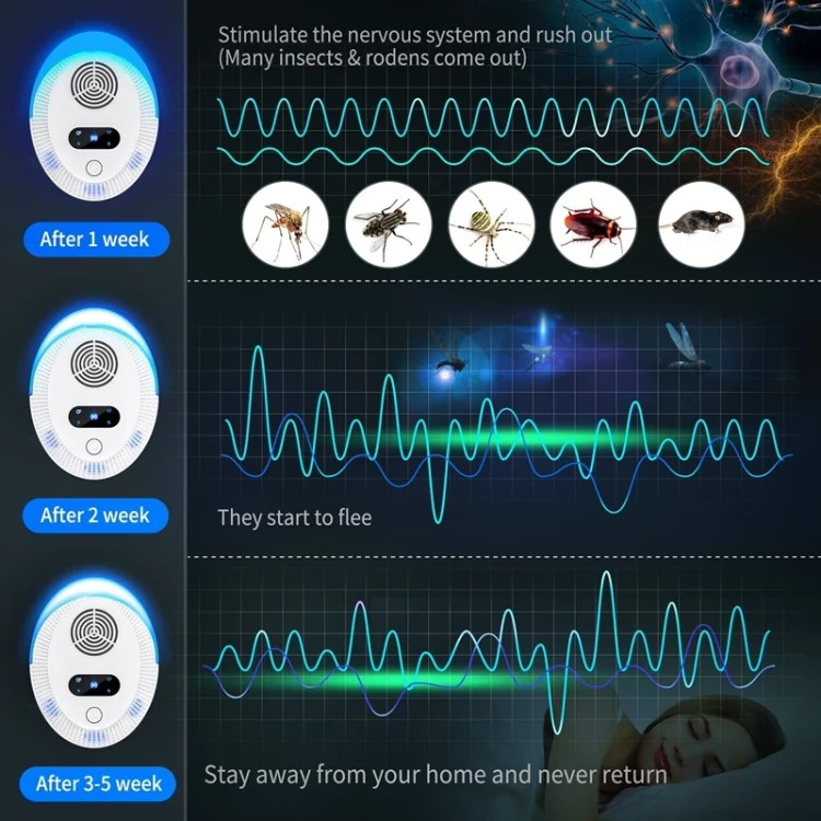 با انتشار امواج اولتراسونیک متغیر، سیستم عصبی و فیزیولوژیکی آفات دچار اختلال شده و آنها مجبور به ترک محل میشوند؛ بدون نیاز به سم یا مواد شیمیایی.