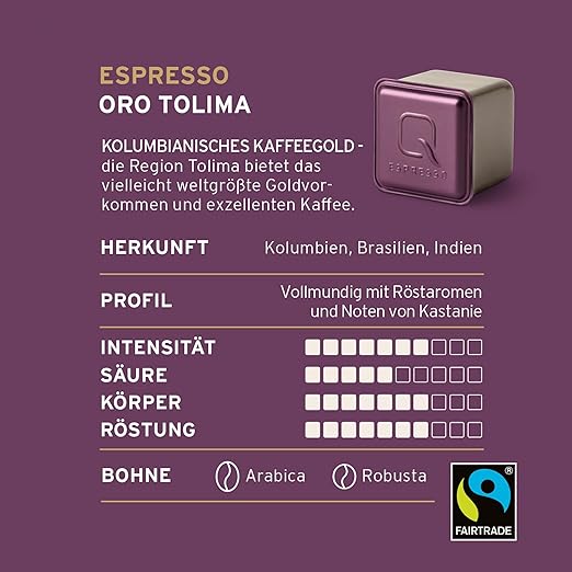 تجربهای متفاوت از قهوه کلمبیا با کپسولهای Qbo مدل Oro Tolima. این قهوه با شدت ۷ از ۱۰، تعادلی بینظیر میان عطر و طعم برقرار کرده است.
