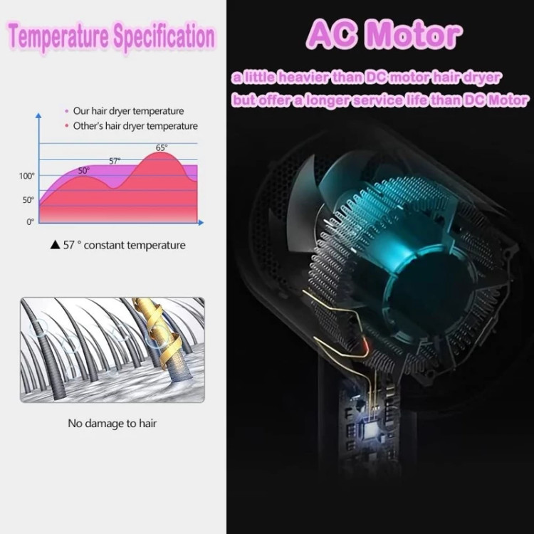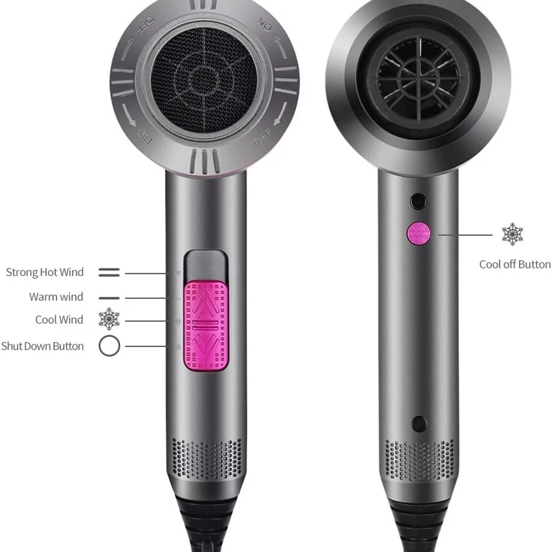 با سه درجه حرارت (سرد، گرم، داغ)، دو سرعت باد و دکمهی باد سرد فوری، میتوانید دما و شدت جریان هوا را مطابق نیاز خود تنظیم کنید. برای حفظ ایمنی، هنگام استفاده دریچه پشتی را مسدود نکنید و دستگاه را با دریچه رو به پایین روی سطح قرار ندهید.